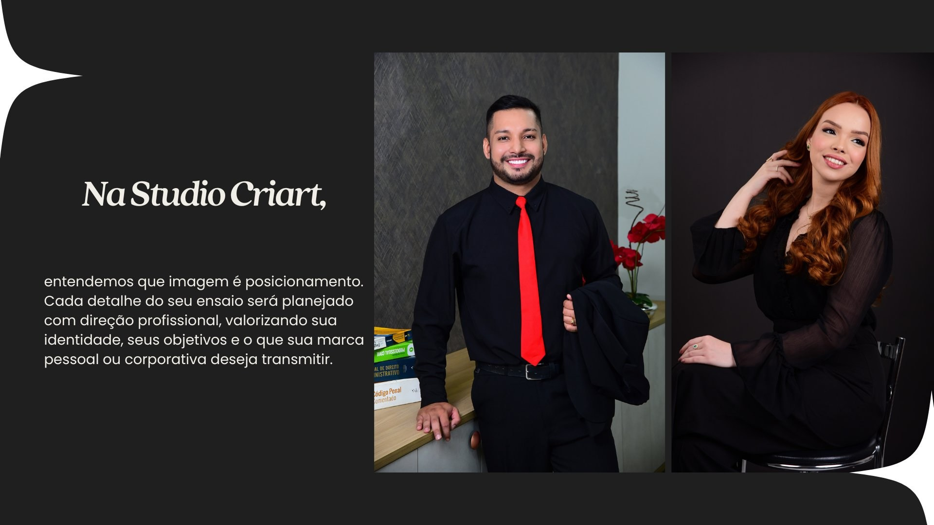 Ao optar por um ensaio com o Studio Criart, você garante não apenas fotos bem tiradas, mas uma experiência completa. Cuidamos de cada detalhe — iluminação, composição, direção de poses e edição — para que o resultado final reflita sua essência com conveniência e bom gosto.